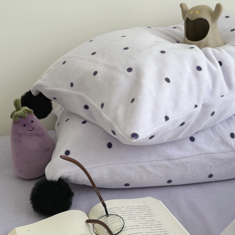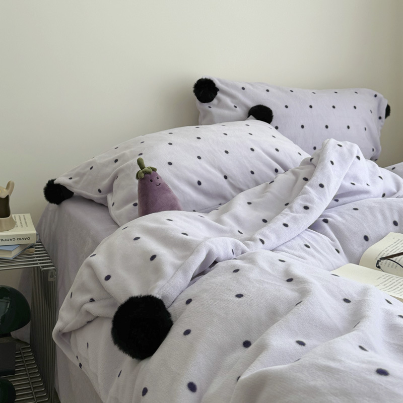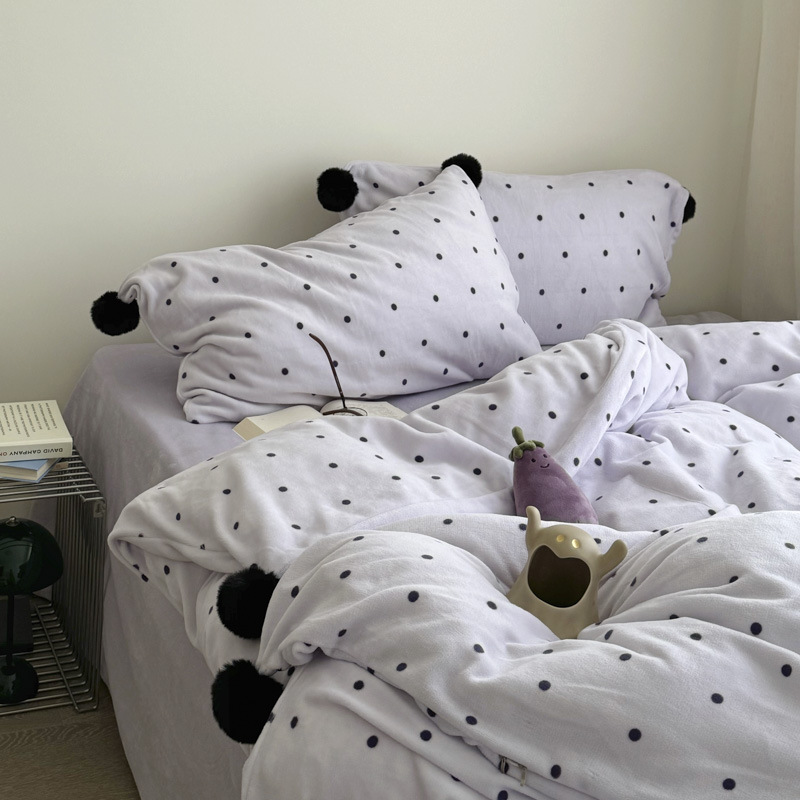 Ins Taro Purple Polka Dot Milk Velvet Four-Piece Winter Warm and Cute Fur Ball Thickeneded Coral Velvet Bed Bed Sheets Quilt Cover